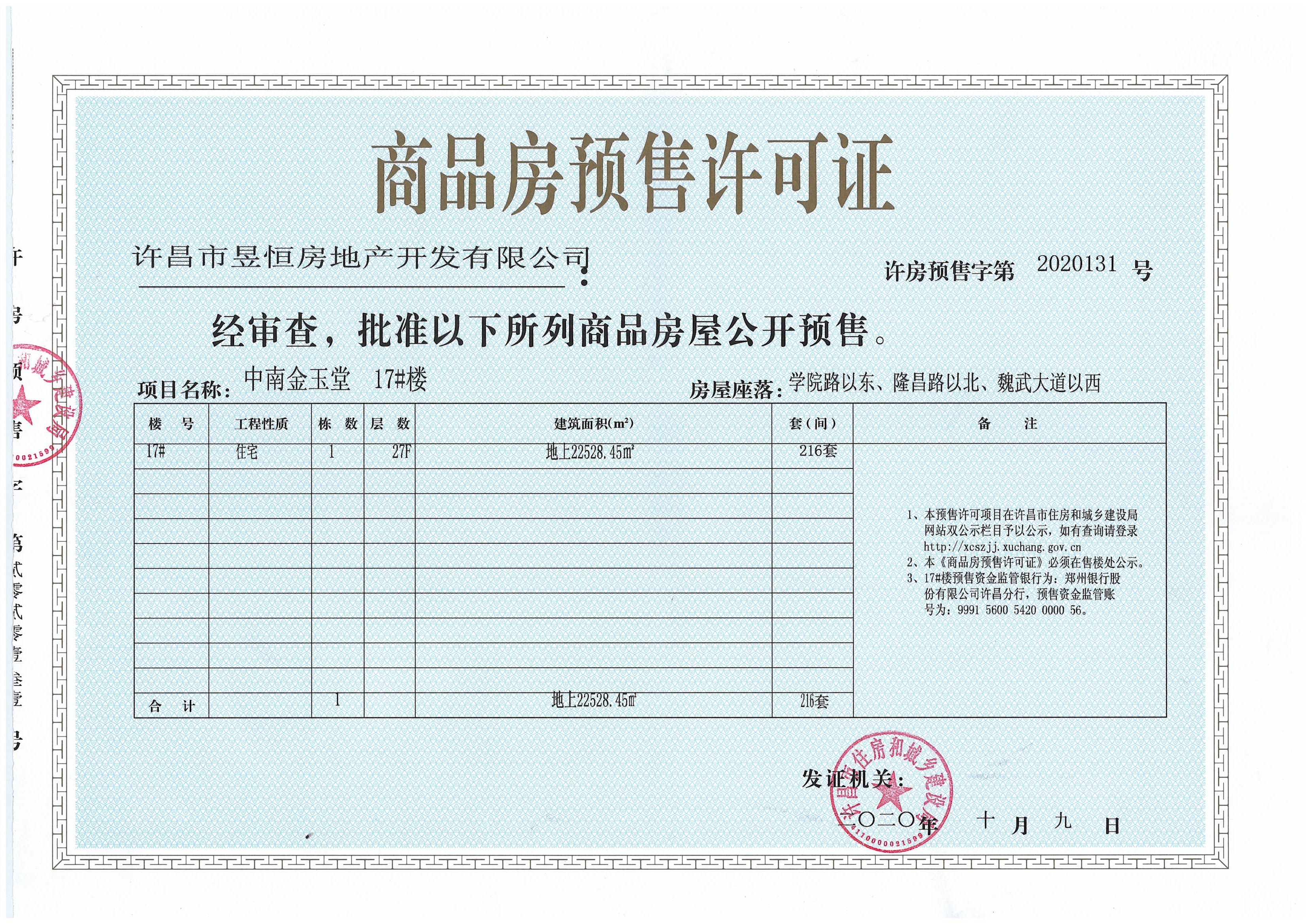 许房预售字第2020131号(许昌市昱恒房地产开发有限公司)