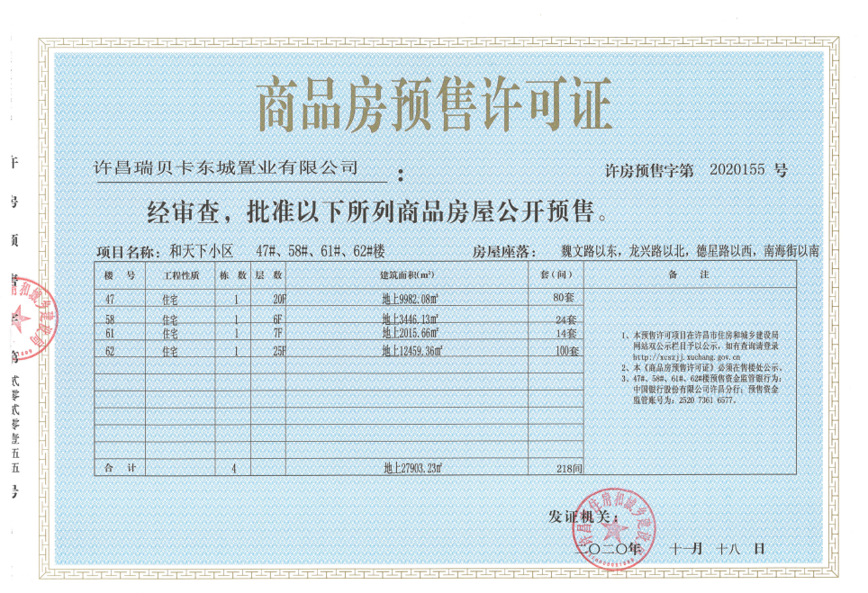 许房预售字第2020155号(许昌瑞贝卡东城置业有限公司)