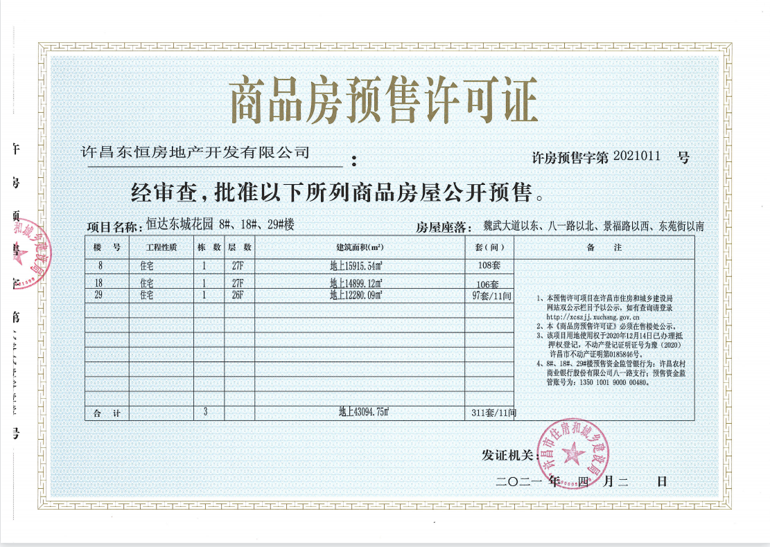 许房预售字第2021011号(许昌东恒房地产开发有限公司)