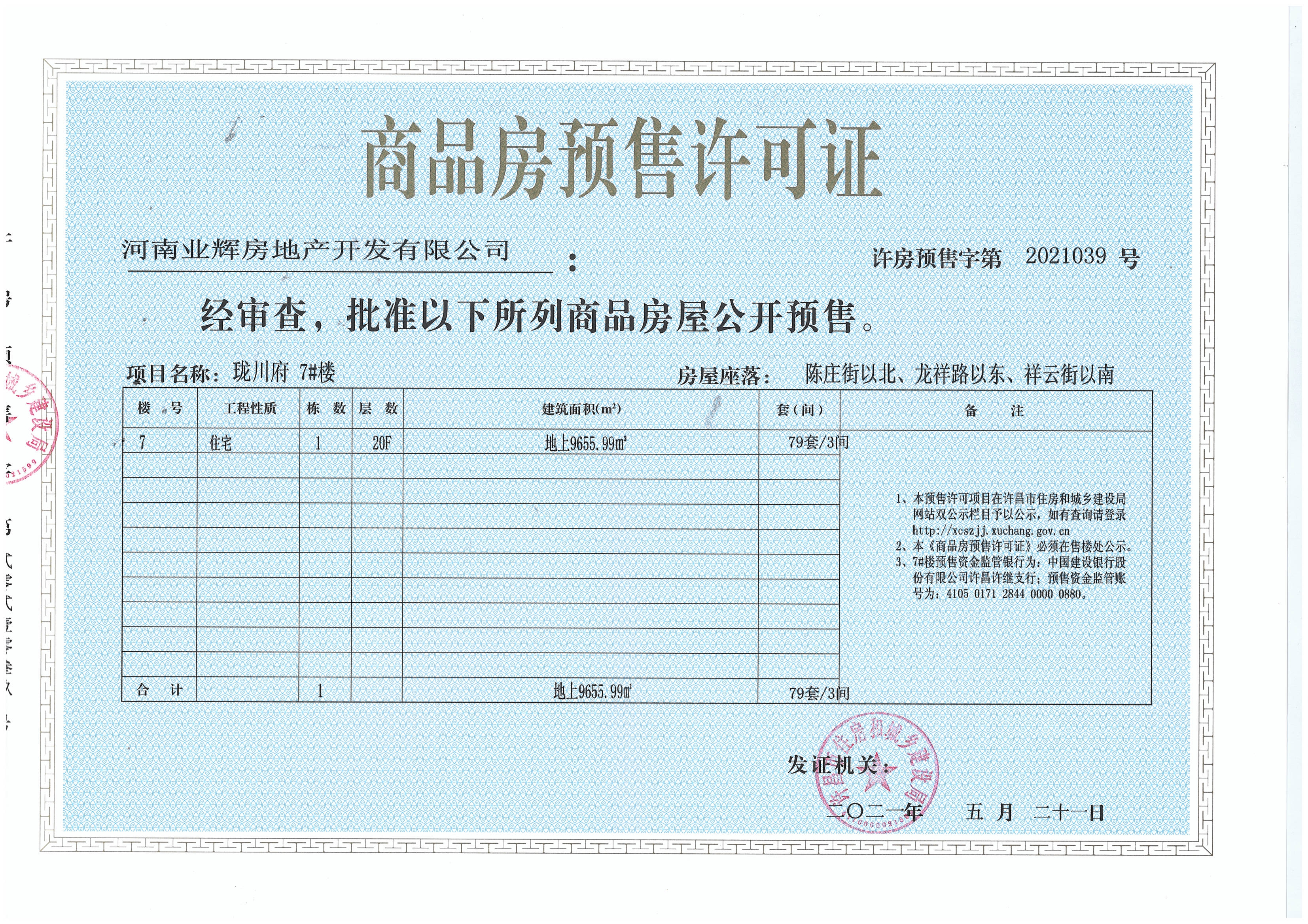 许房预售字第2021039号(河南业辉房地产开发有限公司)