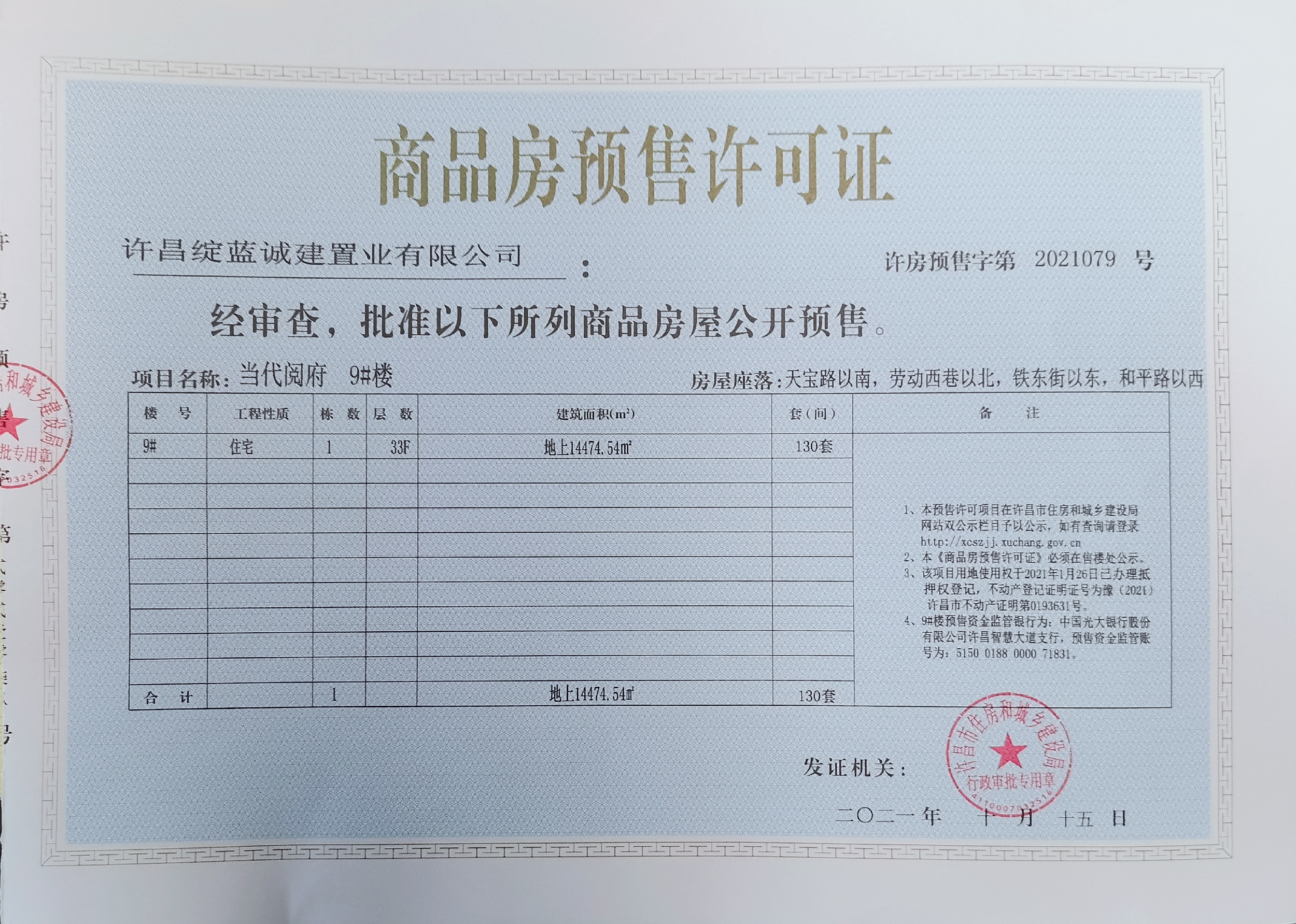 许房预售字第2021079号(许昌绽蓝诚建置业有限公司)