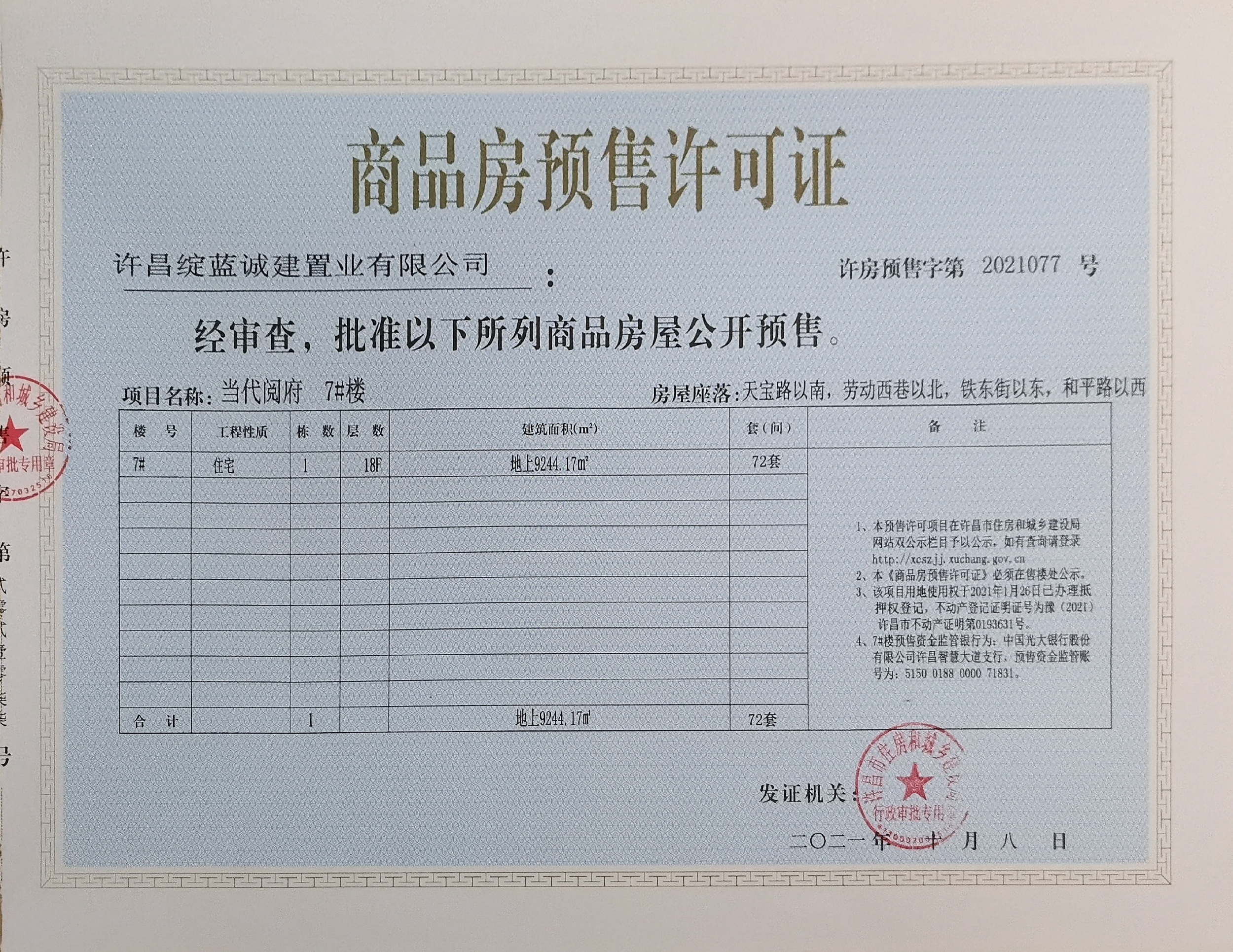 许房预售字第2021077号(许昌绽蓝诚建置业有限公司)