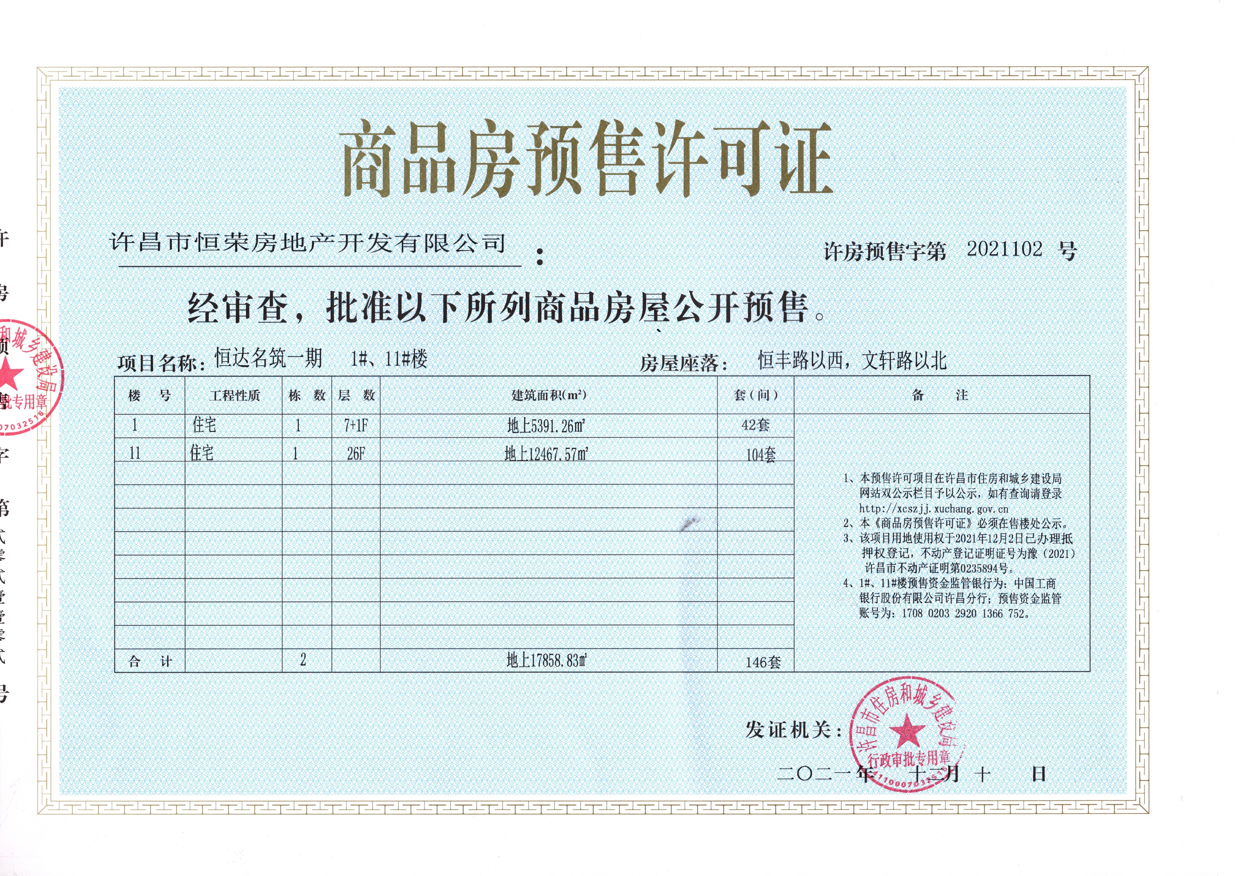 许房预售字第2021102号(许昌市恒荣房地产开发有限公司)