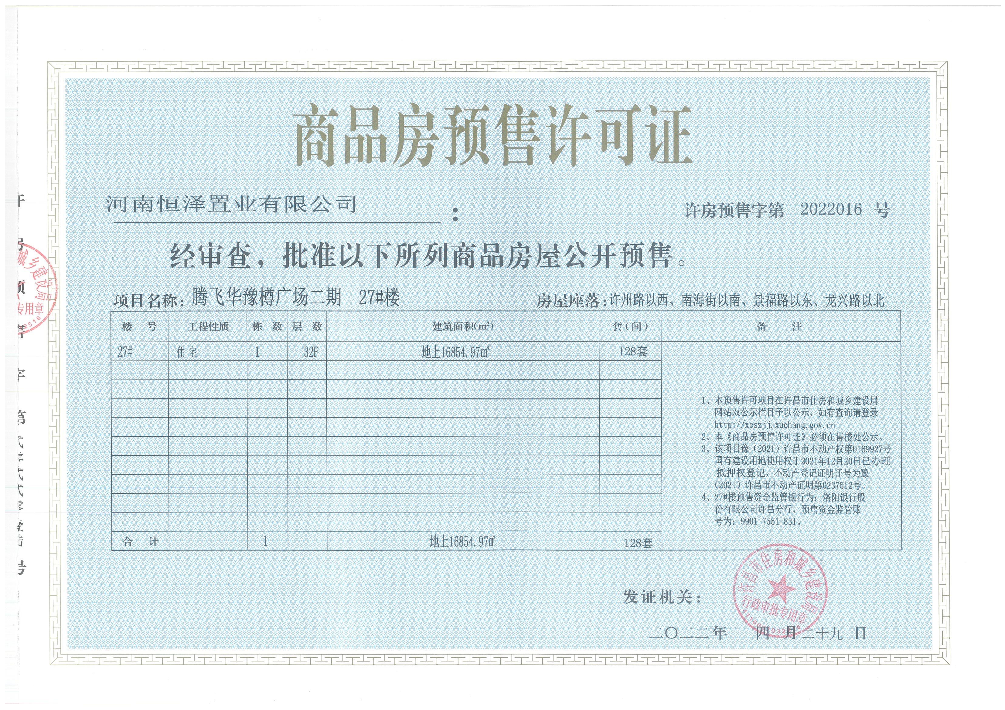 许房预售字第2022016号(河南恒泽置业有限公司)